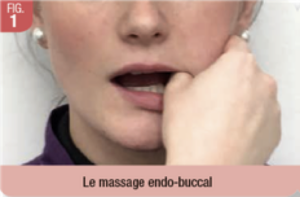 Technique : l’impact et l’effet antalgique sont beaucoup plus grands lorsque ceux-ci sont massés transversalement par voie exo et endo-buccale. Il s’agit de placer le pouce (au niveau de la muqueuse buccale) et l’index et le majeur (au niveau de la joue) de part et d’autre du masséter et de faire glisser les doigts vers la commissure des lèvres.