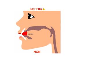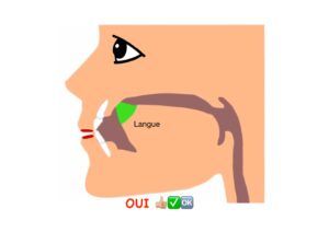 La pointe de la langue doit être en contact avec les « petites vagues du palais » (Papille rétro-incisive) et contact bilabial passif. La langue ne doit pas être contre les dents. Mais attention à ne pas hyper corriger non plus. Il ne faut pas que la pointe de la langue se trouve au niveau du creux du palais. Sinon, ce serait source de tensions supplémentaires.